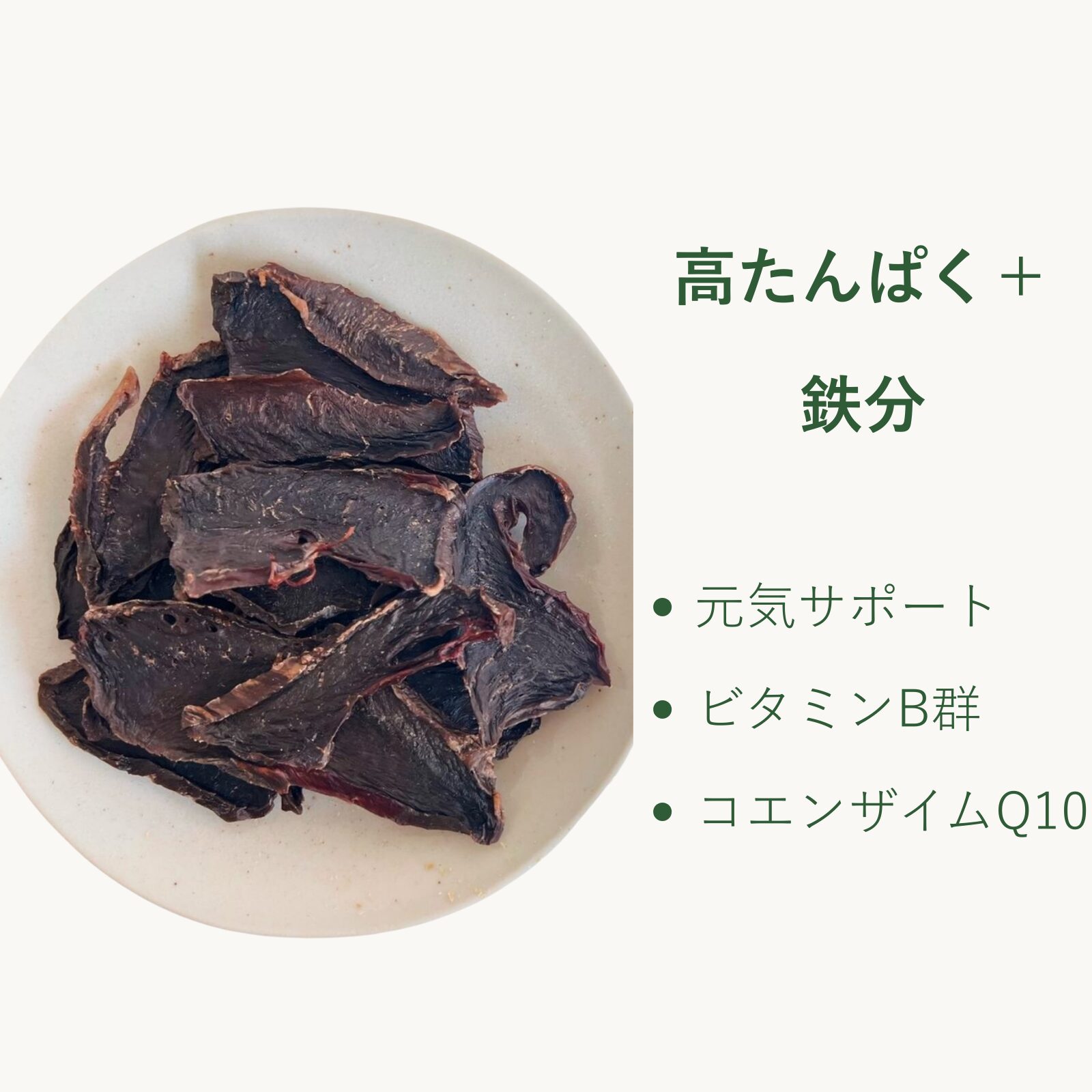 A: 国産牛の心臓(ハツ)をスライスし、低温で丁寧に乾燥させた無添加おやつです。旨味が凝縮され、香ばしい香りとしっかりした食感が特徴です。