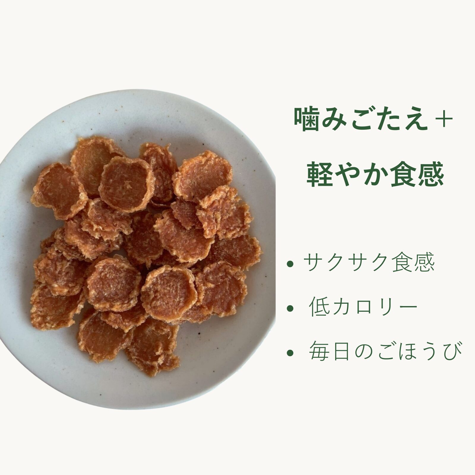 A: 国産鶏むね肉を皮と脂を取り除き、ミンチにしてチップス形に成型した無添加おやつです。低温でじっくり乾燥し、軽い食感と香ばしさが特徴です。